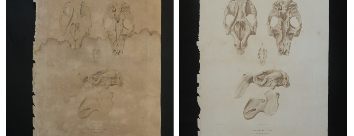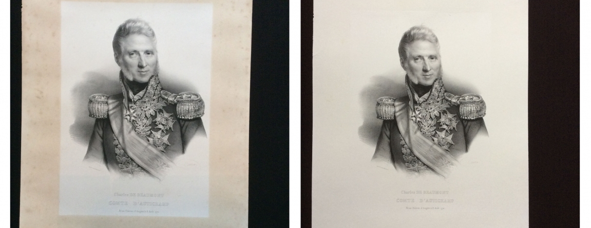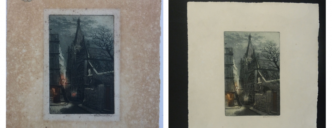En fonction de la technique d’impression ; sérigraphie, eau forte, lithographie, dessin…et de la détérioration de l’œuvre ; taches d’oxydations, mouillures, déchirures… le papier peut être nettoyé et restauré. Le travail peut être réalisé soit sur des pages d’un ouvrage, la couverture d’un broché ou bien même des estampes.